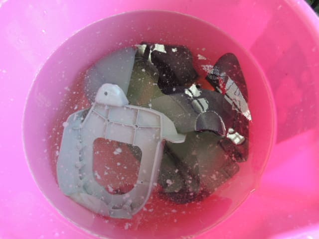 取り外した小物パーツは特殊な液剤へ浸けこみます。
