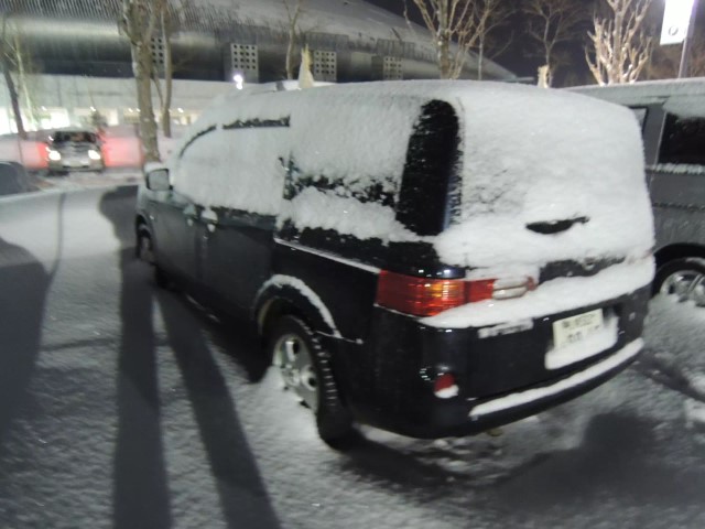 雪で車の形が変わり、更に窓ガラスが凍ってます。