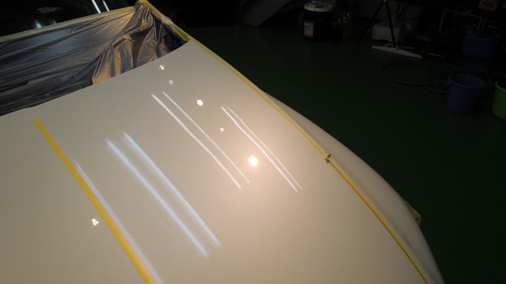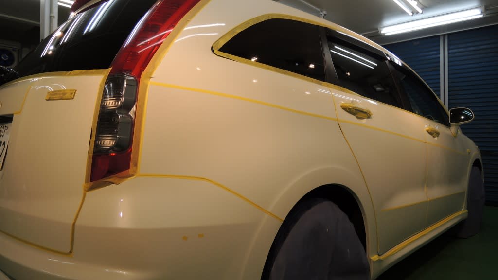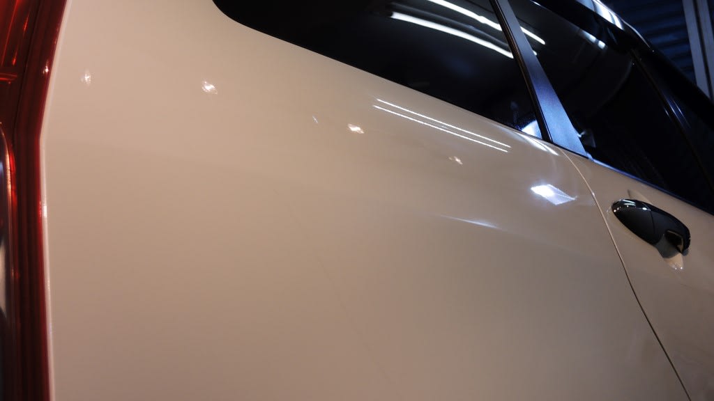 ちなみにこちらの車両は左後部ドアが修正されており助手席からリアフェンダーに掛けてボカしてあります。もちろんキレイに治ってますが注意して研磨を行います。