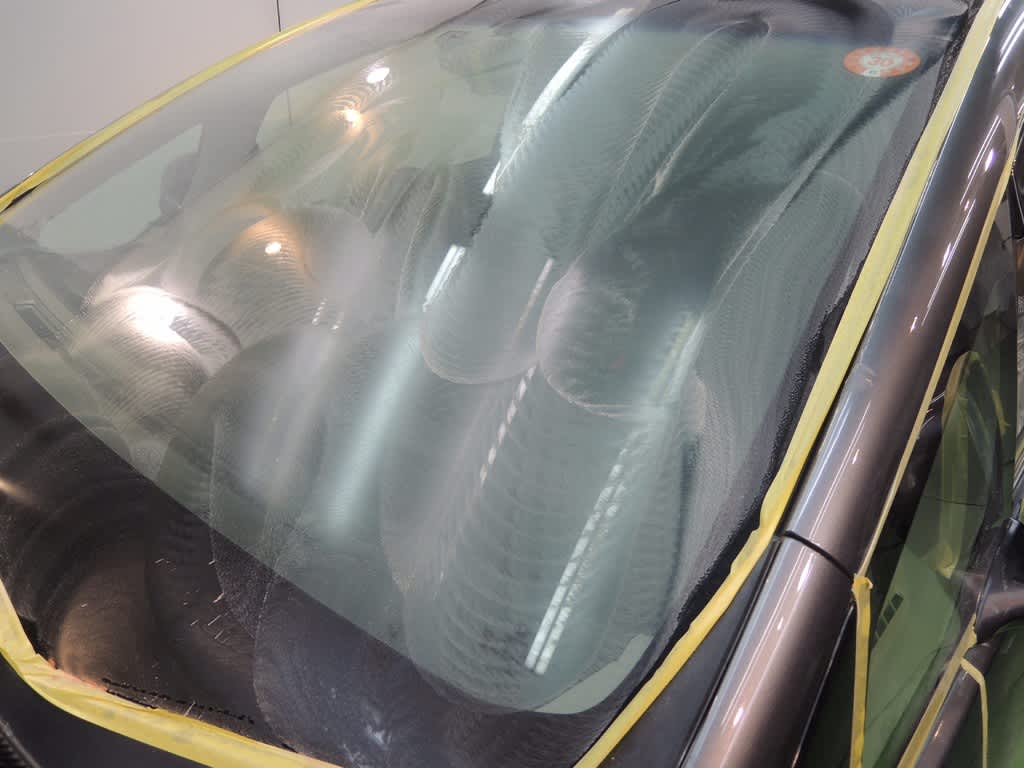 ワイパー部分を確実に養生を行い、液剤が飛び散っても汚れないようにする。
