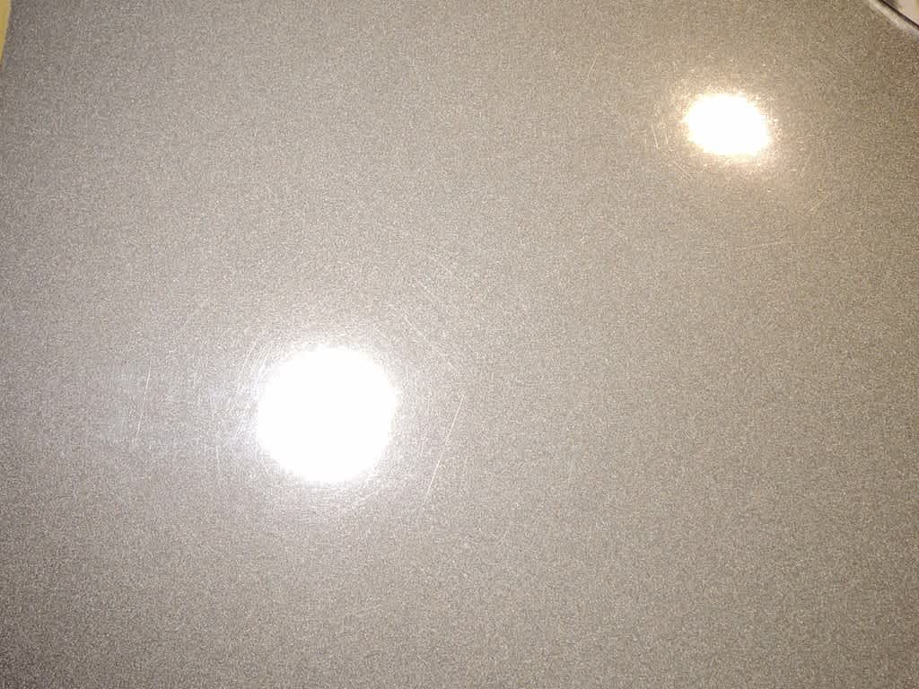 力の強い光源を照らすと傷の見えにくいホワイトでもこれぐらいは見えます。
