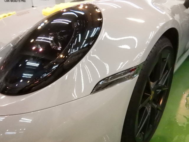 スポーツカー特有の曲面美を最大限に活かすため、塗装表面の油分除去・水シミ(ウォータースポット)除去を含めた下地研磨処理を徹底しました。