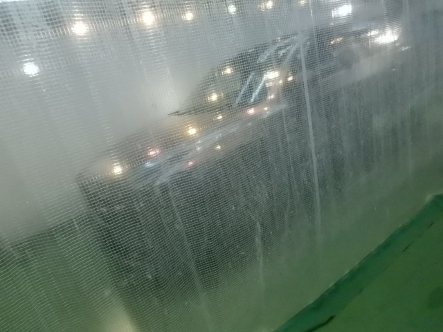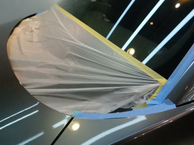 施工時は1台毎に間仕切を使う事でコンパウンド等の粉の被害や温度湿度管理を適正にします。じつはこれ非常に大切な施工環境になりますので要チェックですよ。