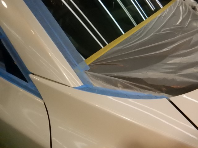 「しっかりとマスキングを行い、弱い部分を保護します。特にヘッドライトは重要です。」