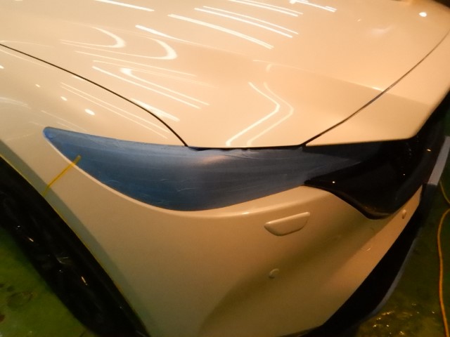 コーティング施工時、ボンネットやバンパーの処理中に、誤ってヘッドライトのハードコートを磨いてしまうケースがあります。これを防ぐためにも、ヘッドライトの保護(養生)は必須です。