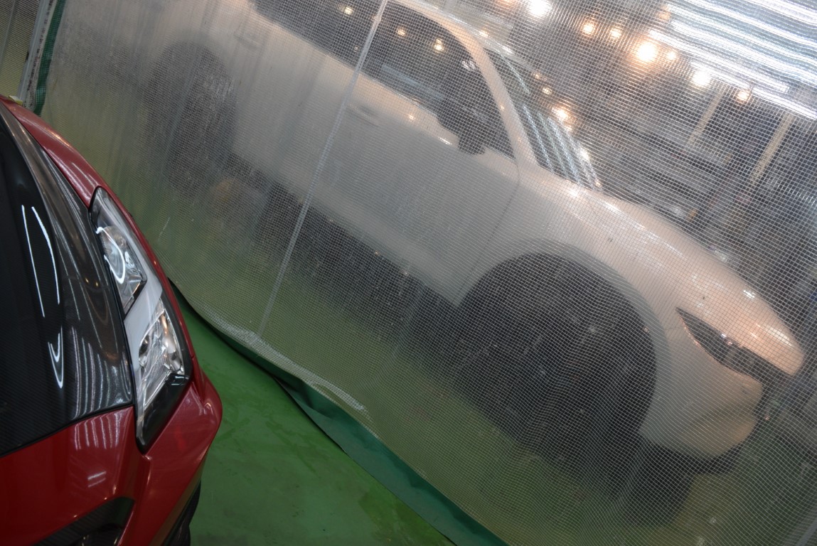 施工時は1台毎に間仕切を使う事でコンパウンド等の粉の被害や温度湿度管理を適正にします。じつはこれ非常に大切な施工環境になりますので要チェックですよ。