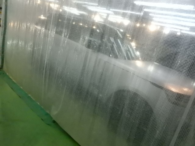 施工時は1台毎に間仕切を使う事でコンパウンド等の粉の被害や温度湿度管理を適正にします。じつはこれ非常に大切な施工環境になりますので要チェックですよ。