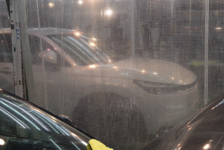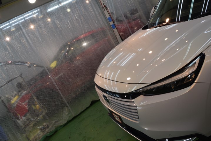 施工時は1台毎に間仕切を使う事でコンパウンド等の粉の被害や温度と湿度管理を適正にします。じつはこれ非常に大切な施工環境になりますので要チェックですよ。