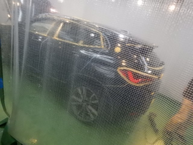 施工時は画像の様に1台毎に間仕切を使う事でコンパウンド等の粉の被害や温度湿度管理を適正にします。じつはこれ非常に大切な施工環境になりますので要チェックですよ。