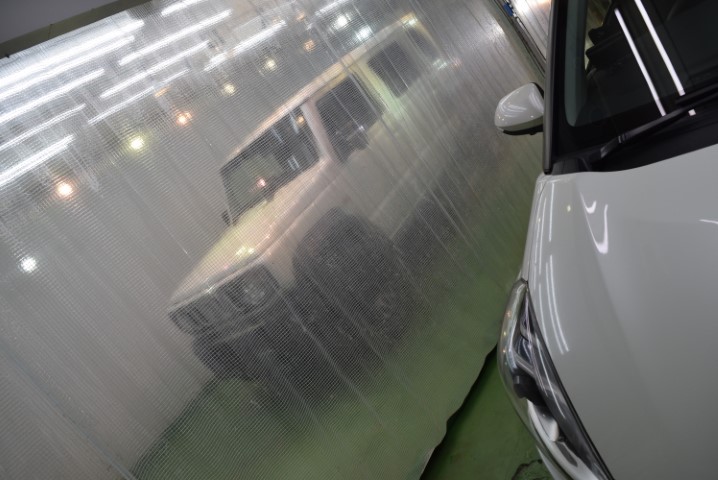 施工時は1台毎に間仕切を使う事でコンパウンド等の粉の被害や温度湿度管理を適正にします。じつはこれ非常に大切な施工環境になりますので要チェックですよ。
