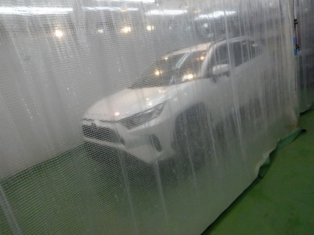 施工時は1台毎に間仕切を使う事でコンパウンド等の粉の被害や温度湿度管理を適正にします。じつはこれ非常に大切な施工環境になりますので要チェックですよ。