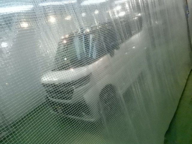 施工時は1台毎に間仕切を使う事でコンパウンド等の粉の被害や温度と湿度管理を適正にします。じつはこれ非常に大切な施工環境になりますので要チェックですよ。