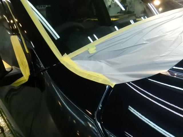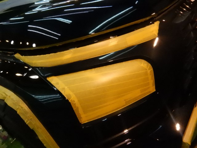 「しっかりとマスキングを行い、弱い部分を保護します。特にヘッドライトは重要です。」