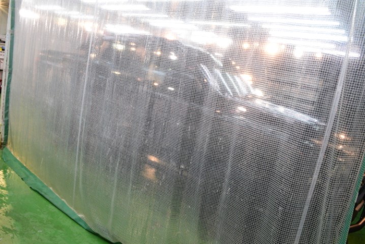 施工時は1台毎に間仕切を使う事でコンパウンド等の粉の被害や温度湿度管理を適正にします。じつはこれ非常に大切な施工環境になりますので要チェックですよ。