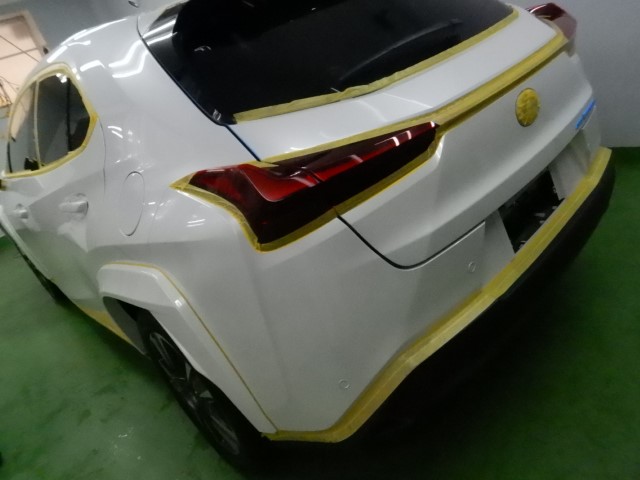 施工時は1台毎に間仕切を使う事でコンパウンド等の粉の被害や温度と湿度管理を適正にします。じつはこれ非常に大切な施工環境になりますので要チェックですよ。