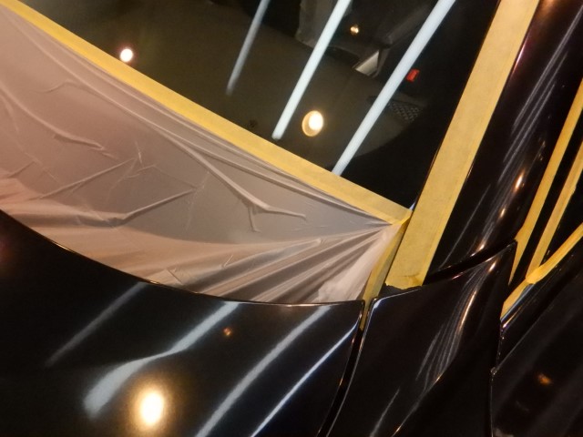 施工時は画像の様に1台毎に間仕切を使う事でコンパウンド等の粉の被害や温度湿度管理を適正にします。じつはこれ非常に大切な施工環境になりますので要チェックですよ。