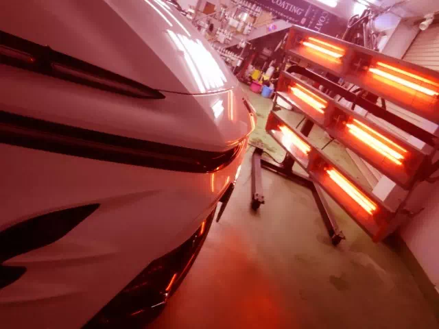 施工時は常温下で初期硬化を行い、その後、遠赤外線ヒーターなどを用いた「焼付処理」で熱を加え、コーティング被膜をしっかりと定着させます。