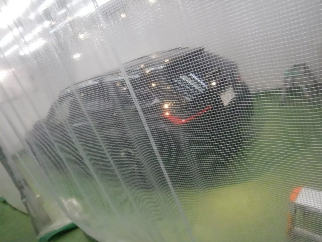 施工時は画像の様に1台毎に間仕切を使う事でコンパウンド等の粉の被害や温度湿度管理を適正にします。じつはこれ非常に大切な施工環境になりますので要チェックですよ。