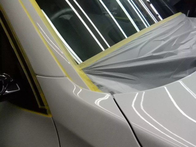 施工時は画像の様に1台毎に間仕切を使う事でコンパウンド等の粉の被害や温度湿度管理を適正にします。じつはこれ非常に大切な施工環境になりますので要チェックですよ。